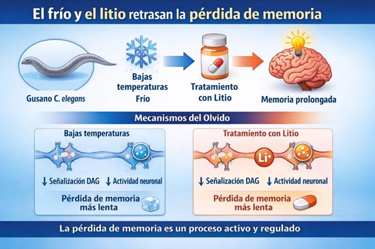 El estudio demuestra que tanto la exposición al frío como el tratamiento con litio pueden retrasar de forma significativa el proceso de olvido en el organismo modelo Caenorhabditis elegans.